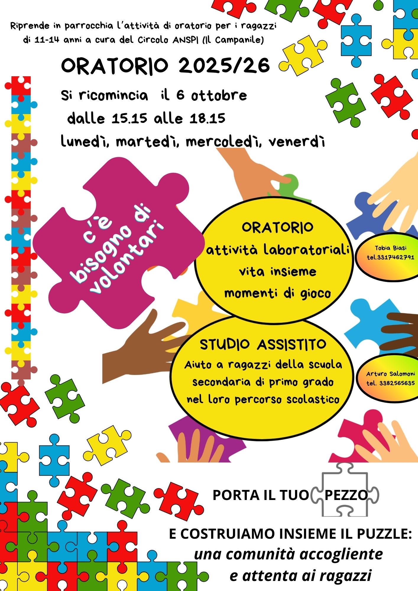 Grazie ai contributi di Fondazione del Monte, di Fondazione Cassa di Risparmio in Bologna e del Quartiere Savena, il circolo ANSPI “Il Campanile” ripropone, anche per l’anno scolastico 2025/2026, l’attività di oratorio ed il servizio di studio assistito per ragazzi tra gli 11 e i 14 anni.